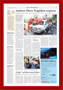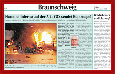 Beitrag über die "Unfallakte: Braunschweig" aus der "Braunschweiger Allgemeinen Zeitung" Veröffentlichung in der "Mülheimer Woche" über die "Unfallakte: A52" Zeitungsbericht über die "Unfallakte: Rellingen" aus dem "Pinneberger Tageblatt"  |